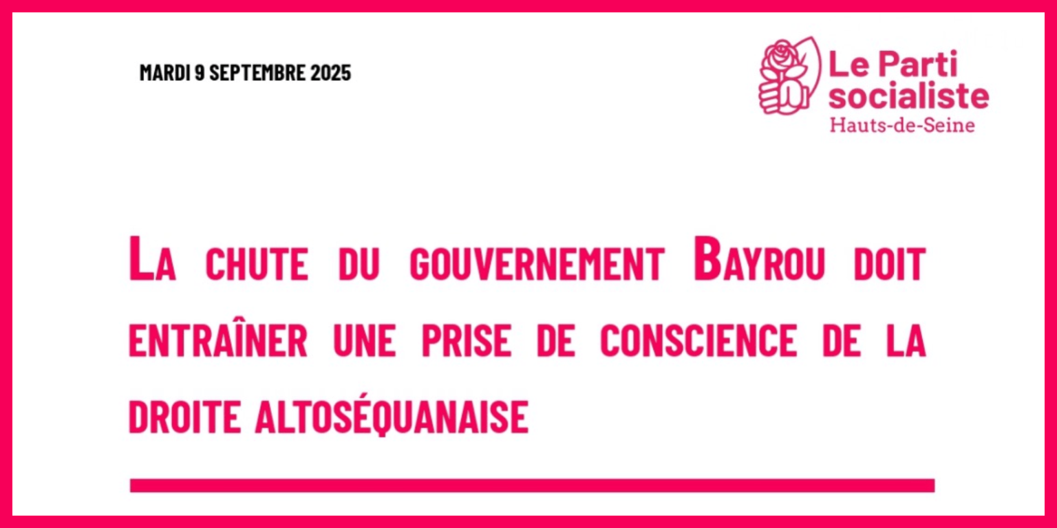 La chute du gouvernement Bayrou doit entraîner une prise de conscience de la droite altoséquanaise 09/09/2025 Actualités départementales Partagez ! Navigation de l’article Précédent Post précédent : Patrice Fabiano – 1952-2025Suivant Article suivant : Non à la banalisation de la haine !